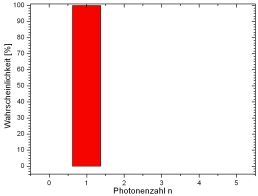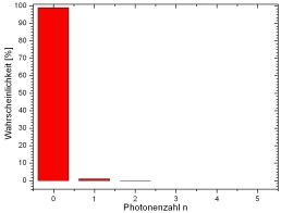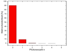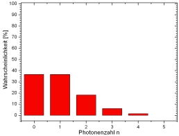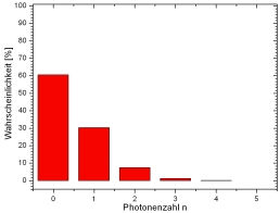 Das Licht eines Lasers kann mit einer elektromagnetischen Welle und der Poissonstatistik beschrieben werden. Die Poissonstatistik hängt von der mittleren Photonenzahl <n> ab. Abgeschwächtes Laserlicht enthält z. B. die mittlere Photonenzahl von <n>=1 (Abb. 3 links). Deutlich sind in der Statistik Photonenanteile mit n=0, n=2, n=3, n=4 zu erkennen. Das Licht besteht aus einer Superposition der photonischen Zustände n=0...n=5.