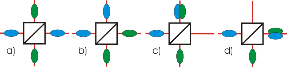 Abb. 1: Vier Möglichkeiten, wie zwei unterscheidbare Quantenobjekte einen symmetrischen Strahlteiler verlassen können.