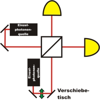 Die Ankunftszeit der Photonen am dem Strahlteiler kann durch eine zusätzliche Wegstrecke im Strahlengang eines Photons verändert werden. Dazu wird ein Verschiebetisch verwendet, dessen Wegstrecke in Schritten bis zu 0,000.1mm verändert werden kann. Da sich Photonen mit Lichtgeschwindigkeit fortbewegen lässt sich mit dem Aufbau eine Zeitdifferenz in Schritten von 0,7fs (Femto-Sekunden) einstellen. Mit dieser Genauigkeit ist das Argument der Gleichzeitigkeit erfüllt.