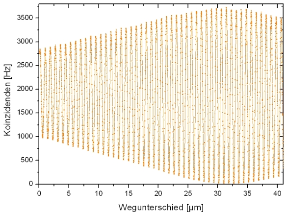 Interferenz ist nur dann beobachtbar, wenn die Kohärenzlänge der Photonen größer als der Weglängenunterschied im Interferometer ist. Sobald der Weglängenunterschied so groß wie die Kohärenzlänge der einzelnen Photonen ist, wird die Sichtbarkeit der Interferenz geringer (Abb. 2). Ist der Weglängenunterschied größer als die Kohärenzlänge, so kann keine Interferenz mehr beobachtet werden. Die Kohärenzlänge der Photonen im Interfereometer beträgt mit einem Bandpassfilter von 810±10nm ca. 60µm. Diese Größe kann experimentell über die Breite der symmetrischen Messkurve in Abbildung 2 oder theoretisch über die folgende Formel bestimmt werden: