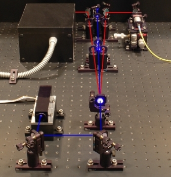 Abb. 1 Angekündigte Einzelphotonenquelle Links: Skizze mit Filtern, rechts: Experiment