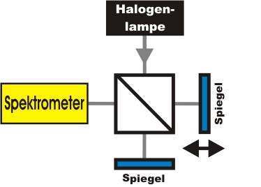 Interferenz kann auch mit hellem Licht im Interferometer beobachtet werden. Als Lichtquelle wird hierzu eine normale Halogenlampe (thermisches Licht) verwendet, das eine sehr geringe Kohärenzlänge besitzt. Als Detektor kann das bloße Auge oder ein Spektrometer eingesetzt werden (Abb. 4). Im Video 1 wurde der Verschiebetisch um ca 100nm/s bewegt und das jeweilige Spektrum aufgezeichnet. Deutlich ist eine Interferenz der einzelnen Wellenlängen erkennbar.