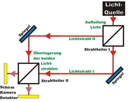 Interferenz kann auch bei hellem Licht beobachtet werden. Für ein Interferenzmuster wird Licht von zwei räumlich getrennten Lichtquellen überlagert. Um ein Interferenzmuster beobachten zu können müssen beide Lichtquellen eine zeitlich feste Phasenbeziehung besitzen. Aufgrund der hohen Frequenz von Licht ist eine feste Phasenbeziehung zweier unabhängiger Lichtquellen experimentell nur schwer zu realisieren. Für Interferenzmuster aus Licht wird deshalb ein Lichtstrahl über einen 50% Strahlteiler in zwei gleichhelle Lichtstrahlen aufgeteilt (Abb. 2). Die beiden Lichtstrahlen durchlaufen unterschiedliche Wege und werden auf einem zweiten Strahlteiler überlagert. Eine solche Anordnung wird ganz allgemein als Interferometer bezeichnet.