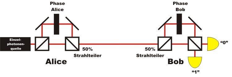Abb. 1: Quantenkryptographie mit einzelnen Photonen und Phasenkodierung