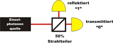Richtige Zufallszahlen können mit Hilfe der Quantenphysik erzeugt werden. Trifft ein einzelnes Photon auf einen Strahlteiler, wird es absolut zufällig reflektiert (Binär 1) oder transmittiert (Binär 0) (Abb. 1). Hinter der Entscheidung steckt keine mathematische Rechenvorschrift. Ein solcher Quantenzufallsgenerator wird im Abschnitt Quantenzufall mit Experimenten ausführlich beschrieben.