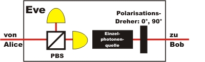 Leider ja. Der Spion Eve (von engl. eavesdropping = Abhören) kann sich mit der folgenden Einheit (Abb. 4) unbemerkt in den Strahlengang einschleichen. Die Einheit von Eve enthält die Empfangseinheit wie bei Bob und die gleiche Sendeeinheit wie bei Alice. Eve empfängt das Photon, kennt somit die Binärzahl und schickt ein entsprechendes Photon mit der gleichen Polarisation an Bob weiter. Was bringt nun die Übertragung des geheimen Schlüssels mit einzelnen Photonen? Bisher absolut keine Sicherheit! Gibt es hierzu weitere Möglichkeiten [weiter]?