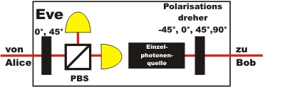 Bisher kann noch nicht gesagt werden, ob sich der Aufwand mit den beiden Basen für die sichere Generierung des Schlüssels zwischen Alice und Bob wirklich gelohnt hat. Auch der Spion Eve kann ihre Abhöreinrichtung mit zusätzlichen Polarisationsdrehern für die Wahl der zwei Basen aufrüsten (Abb. 5) .