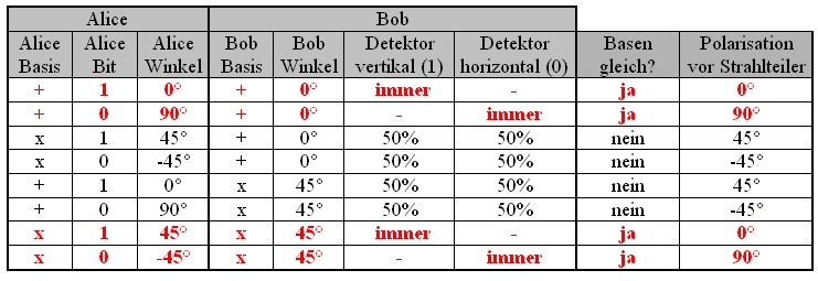 Wenn Alice das Photon in der Basis + mit der Polarisation 0° oder 90° verschickt und Bob die Basis + wählt, so gibt es eindeutige Ergebnisse. Wenn Alice das Photon in der Basis x mit der Polarisation -45° oder 45° verschickt und Bob die Basis x wählt, so gibt es wieder eindeutige Ergebnisse. Wenn Alice und Bob zufällig die gleichen Basen wählen, sind die übertragenen Daten eindeutig und können für den Schlüssel verwendet werden (Tabelle 1). Wenn Alice das Photon in der Basis + mit der Polarisation 0° oder 90° versendet und Bob die Basis x wählt, dann ist das Photon vor dem Strahlteiler diagonal polarisiert. Trifft ein diagonal polarisiertes Photon auf einen Polarisationsstrahlteiler, so wird das Photon mit der Wahrscheinlichkeit von 50% transmittiert oder mit der Wahrscheinlichkeit von 50% reflektiert. Das gleiche 50% zu 50% Verhalten am Strahlteiler ergibt sich, wenn Alice das Photon in der Basis x verschickt und Bob zur Messung die Basis + wählt. Wenn Alice und Bob verschiedene Basen wählen, sind die übertragenen Daten absolut zufällig und nicht zu gebrauchen (Tabelle 1).