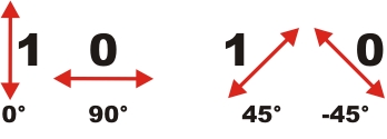 Um Spione bei der Quantenkryptographie aufdecken zu können, müssen zusätzliche Elemente in das System eingefügt werden. Bob und Alice benutzen deshalb zwei Messbasen: Basis Plus (Bezeichung: +) und Basis X (Bezeichung: x). In jeder Basis gibt es eine fest definierte Polarisationsrichtung für die beiden Bits 1 oder 0. In der Basis + entspricht die Polarisation von 0° dem Bit "1" und die Polarisation von 90° dem Bit "0" (Abb. 1 links). In der Basis x entspricht die Polarisation 45° dem Bit "1" und die Polarisation -45° dem Bit "0" (Abb. 1 rechts).