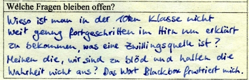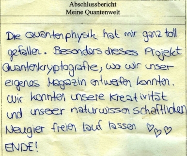 Vor dem Beginn der Unterrichtseinheit erhielt jeder Schüler das Lerntagebuch „Meine Quantenwelt“ (Abb. 1). Nach jeder Stunde mussten die Schüler den Lernzuwachs dokumentieren („Was hast du heute gelernt?“), die eigene Vorstellung reflektieren („Wie stellst du dir Quantenobjekte vor?“) und verbleibende Fragen („Welche Fragen bleiben offen?“) formulieren. Am Ende der Unterrichtseinheit musste auf der letzten Seite des Tagebuchs ein Abschlussbericht zum „Ausflug in die Welt der Quanten“ formuliert werden. Im Folgenden werden einige Schülermeinungen vorgestellt.