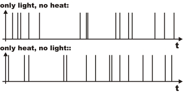 Let us have a look at a photodetector in darkness. It exhibits so called dark count, i.e. events triggered by thermal excitation, as shown in figure 2. The time evolution is a Poisson distribution as for light detection. Such noisy behaviour is very common in various branches of technology. Usually, one does not derive a “quantum behaviour of heat” from the observation – therefore one should not conclude quantum behaviour of light from the analogue observation.
