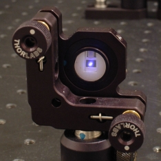 In our laboratory (and many research laboratories around the world) a different process is used for convenience. Certain transparent crystals (fig. 4) convert photons into pairs of photons. The conversion efficiency is quite low, but these crystals are very easy to handle and additionally the photon pairs are emitted in certain spacial directions when the crystal is excited by a laser. The process is called parametric down conversion, shortened to PDC. In our setup (fig.5), we generate two photons of equal wavelength 810nm from a blue photon at 405nm.