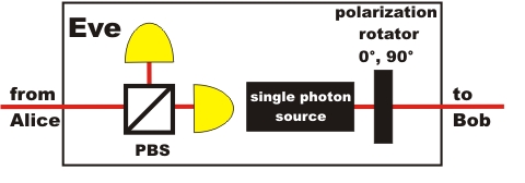 Unfortunately the answer is yes. The spy Eve (so called after eavesdropping) can creep unnoticed into the optical path with the following unit (pic. 4). Eve's unit includes the receiver unit like Bob's and the sender unit like Alice's. Eve receives the photon, therefore knows the binary number and sends an accordant photon with the identical polarization to Bob. So what use is the transmission of the secret key code using single photons really, regarding security? It does not mean absolute security so far anyway! Are there any alternatives [forward]?