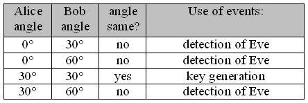 The angles chosen for the Wigner-inequality depend on the entanglement state of the photon pair source. Our photon pair source (type 1-source) emits the Bell-state Φ+. Alice and Bob get the data for calculating the Wigner-inequality from the randomly selected different angle settings of the polarization rotators (table 1). If the measuring angles differ, these data are used after transmission for calculating the Wigner-inequality. Identical measuring angles are used for key code generation. All data recorded are embraced in the entanglement protocol.