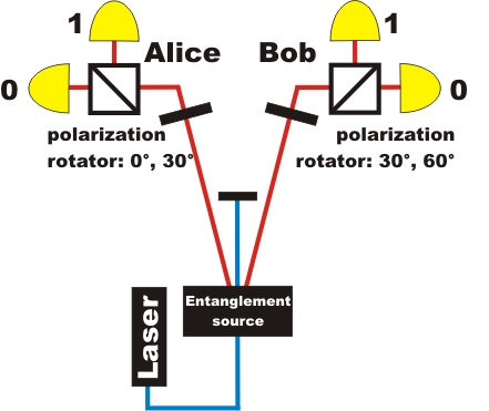 The set-up for the real experiment on entanglement quantum cryptography is shown in picture 2. The polarization rotators on Alice's and Bob's side each have fixed angle settings: 0° and 30° for Alice, 30° and 60° for Bob.