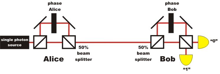 Instead of encoding photons by polarization, we can also use the phase φ for encoding the photons. The system for quantum cryptography via the phase φ works with the quantum phenomenon single photon interference in the interferometer. For quantum cryptography with phase encoding, a large Mach-Zehnder interferometer is split up into two interferometers. One interferomteter is placed on Alice's side, the other on Bob's side (pic. 1). In each interferometer, the phase is altered via an additional optical element in an interferometer arm.