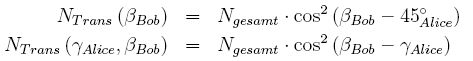 In the following interactive experiment the λ/2 plates in front of Alice’s detector has a fixed value for a polarization of 45°. The λ/2 plates in front of Bob’s detector can be changed between 0° and 90°. It is nearly the same setup as the experiment Malus law (T = 100% cos²(α)), which is described in section Basics. What would you expect?