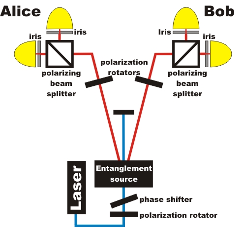 Alice’s detector is based on the detector in the quantum random generator. A λ/2 plate is placed in front of her beam splitter in order to rotate the plane of polarization. This device effectively rotates Alice's entire detection system around the optical axis. Obviously, the λ/2 plate is a very convenient way to overcome mechanical problems. Bob’s side is exactly the same as Alice’s. The measurements are coincidences between Alice and Bob. In the following interactive screen experiment you can investigate entangled photons and non-entangled photons at a fixed beam splitter ratio of 50%.