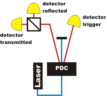 The existence of indivisible photons is to be shown experimentally. The light source emits pairs of photons (see basic principles). One of the photons is absorbed in the trigger detector and the other photon of the pair is now known to be present. This photon is incident on an optical beam splitter, as shown in figure 1. The analysis of observation can be done in different ways: