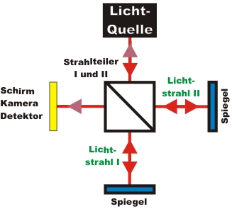 The set-up for experiments should be rather simple and consist of only a few components. The Mach-Zehnder interferometer sketched above can be simplified by replacing the two beam splitters by one beam splitter (pic. 4). With this simplified interferometer, the light from the light source is initially split into two light beams at the beam splitter. The light beams then hit a mirror behind the beam splitter, and are then overlapped again at the same beam splitter. This interferometer gets its name from the scientist Michelson (1852-1931).